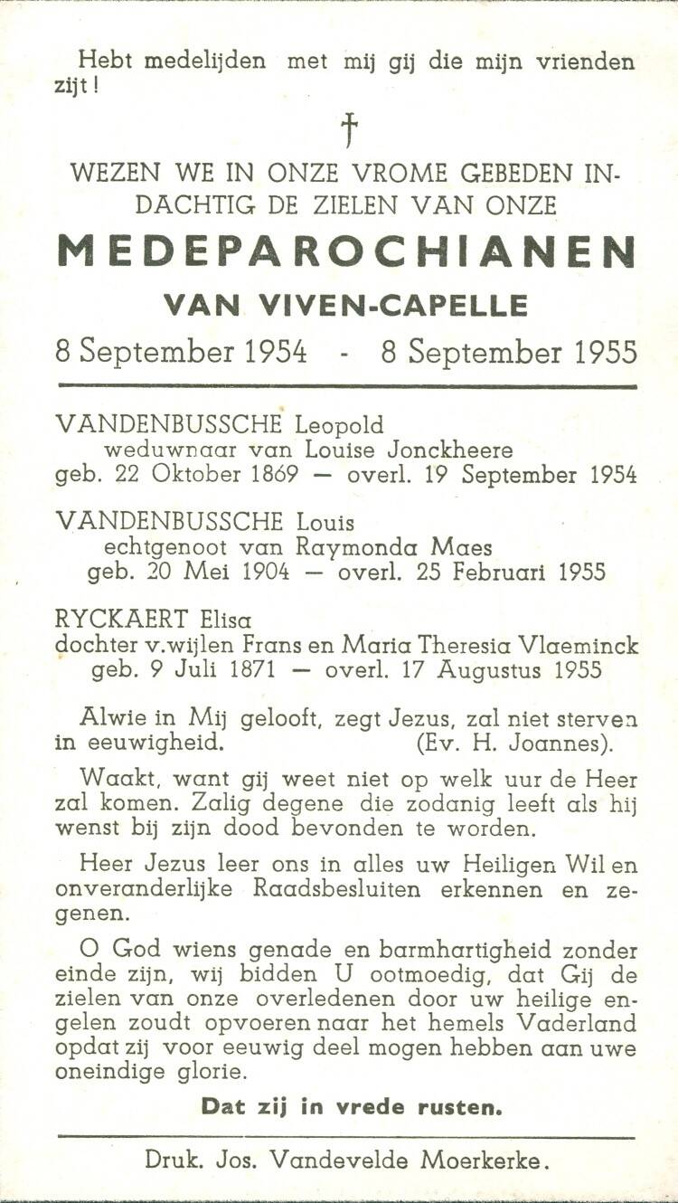 Tot 1977 maakte Vivenkapelle deel uit van Sint-Kruis. Nadien ging het over naar de gemeente Damme. Elk jaar werd op 8 september, feest van Maria-Geboorte, een bidprentje uitgedeeld met daarop de namen van de overledenen die sinds de vorige viering kerkelijk werden begraven.