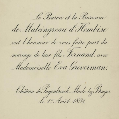 Marc Anatole, de jongste zoon van Ferdinand, kwam samen met zijn moeder Eva Groverman om in Pietra Ligure (Italië) bij een verkeersongeval op 6 januari 1926. Hij was nog student landbouwkunde. Deze kaarsenobiit van zwart geschilderd karton, met daarop het (accolade)wapenschild van de familie de Maleingreau d'Hembise, hing aan één van de rouwkandelaars naast de kist. Het familiewapenschild is als volgt opgebouwd: in keel een keper van zilver, het schildhoofd van zilver met een gaande leeuw van keel. Het schild wordt getopt door een baronnenmuts. In de hoeken vormen de cijfers het jaartal 1926. Hoogte 34.5 cm, breedte 28.7 cm, diepte 0.2 cm (Kerkfabriek Heilig-Kruisverheffing en Sint-Jozef Sint-Kruis, object PWV.0710.0106)