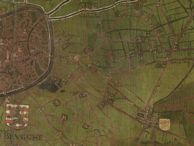 ◄ Centraal op dit fragment uit de Heraldische kaart van het Brugse Vrije van Deventer (1558) valt het landgoed Pudenbrouck met naam op, ten zuiden van de ‘gerechte van Male’ (= Malegalg). De site is herkenbaar aan de complexe grachtenstructuur met ten noorden ervan het kasteel met een toren. Ten zuiden van de weg naar Antwerpen ligt de omwalde site Bouchoute. Meer naar rechts is de strijkijzervormige vijver en het kasteel van Male getekend. Het is de oudste gekende afbeelding.