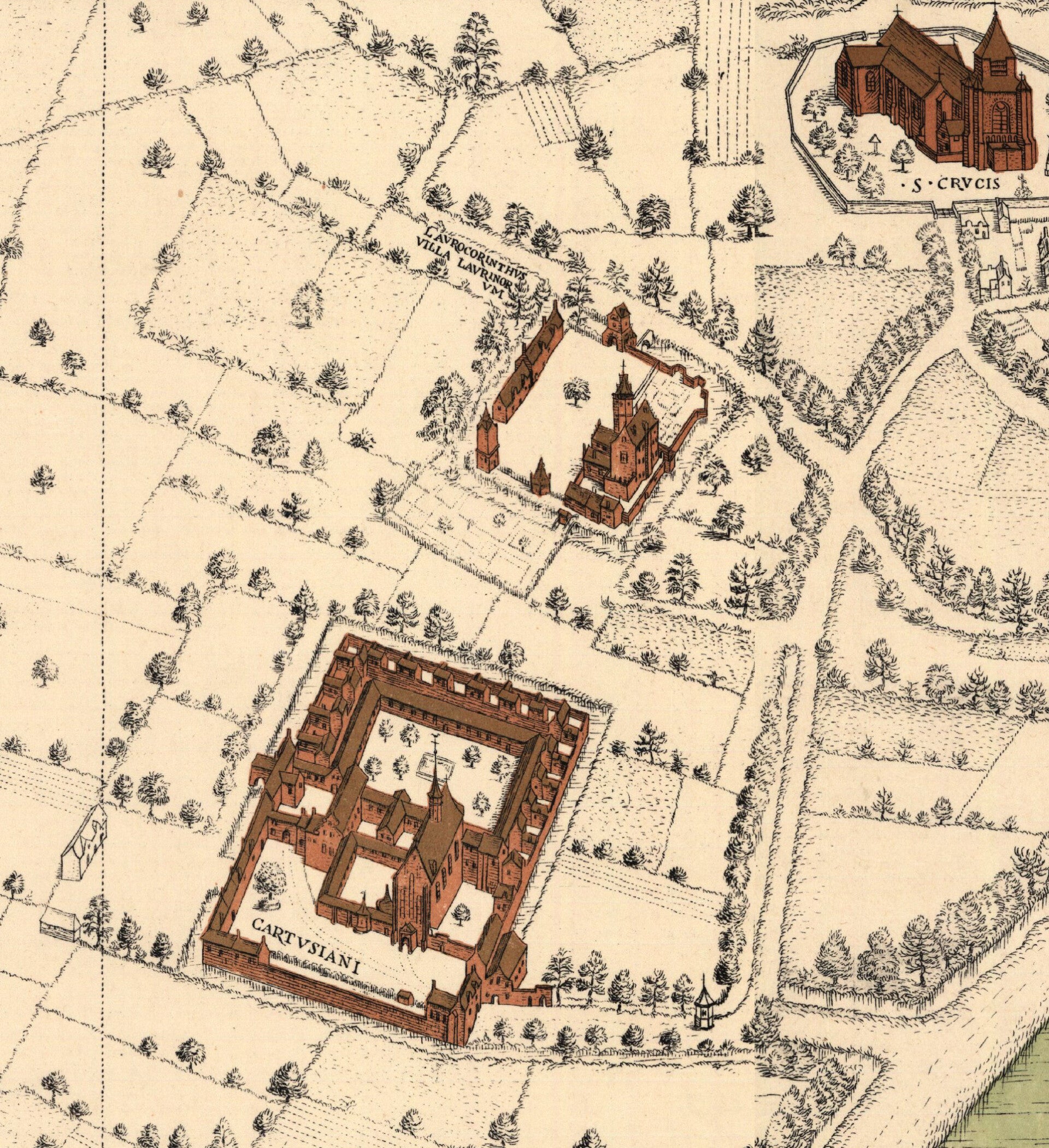 ▲ Het plan van Marcus Gerards (1562) geeft een mooi beeld van het omwalde gebastioneerde ‘t Blaeuwe Casteel gelegen tussen de kerk en het kartuizerklooster Genadedal. Het kasteel heeft een woongedeelte, duiventoren en zwanenhuis. De hoofdingang (boven) had een zware bovenbouw. De bewoners van het kasteel hadden zicht op de kluizen van het nabijgelegen kartuizerklooster.