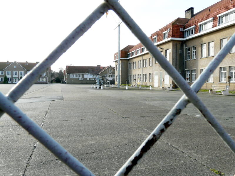 De militaire zone op een luchtfoto, genomen vanop de in aanbouw zijnde watertoren door Jean Van Nieuwenhuyze in de winter van 1961. De witte villa centraal op de foto is zijn woning langs het stukje Leopold Debruynestraat waarlangs vandaag de achterkant van de Delhaize en de huidige ingang van de kazerne liggen. Linksboven vallen de gebouwen van de marinekazerne op, nog zonder zendmast. Rechts ligt het waterzieke soldatenveld dat zich uitstrekte tot aan de Doornhut. Er waren nog geen parkings of warenhuizen.
