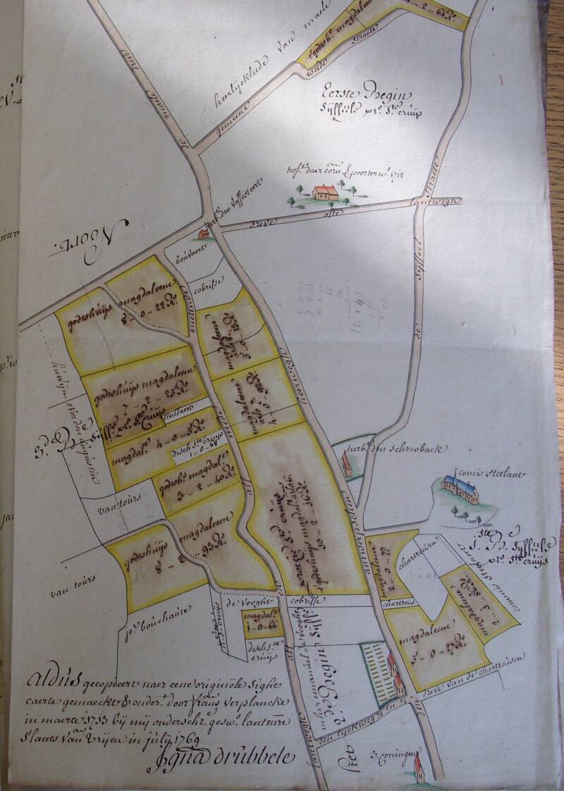 ◄ Op deze kaart, in 1769 door Drübbele nagetekend van een origineel uit 1713 van landmeter Frans Verplancke, staan de percelen links van de Antwerpse Heerweg (Maalse Steenweg) vermeld als eigendom van het godshuis Magdalena (geelbruin), de ‘disch' en de 'prochie van Sint-Kruis' (wit). Rechts van de steenweg Veltem, herberg De Schrooback en bovenaan herberg De Vossensteert, beneden herberg Voormezele. (Magdalenalandt te prochie St-Cruys, TBO, 1769, OCMW-archief, SAB).