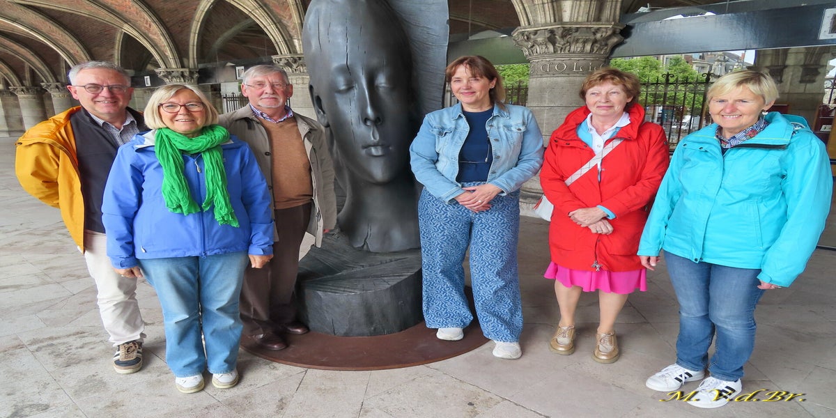 We lieten de eer aan Johan om het glasraam officieel te overhandigen. Na een klassiek bezoek aan culturele pareltjes van de stad Leuven eindigden we in het KADOC (Katholiek Documentatiecentrum) in de Vlamingstraat dat sinds een gesubsidieerde overheidsopdracht allerhande archieven van geestelijk leven in de ruime zin van het woord bewaart: van de vele klooster- en abdijenarchieven over de katholieke verenigingen heen tot archieven van andere religies en zelfs esoterische verenigingen. Liefst 36 km archiefdozen lang. Nu reeds. Het bezoek aan de kelders toonde aan dat daar behoorlijk ruimte voor nodig is. Gevoed met enkele interessante informatie over verzamelen en ontsluiten vertrok de delegatie nadien richting Brugge.